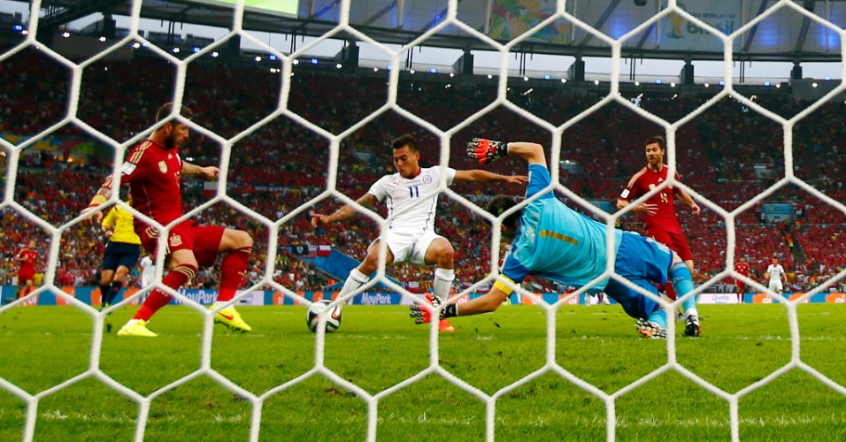 Aránguiz aproveita rebote de Casillas na grande área e chute forte para marcar o segundo do Chile contra a Espanha