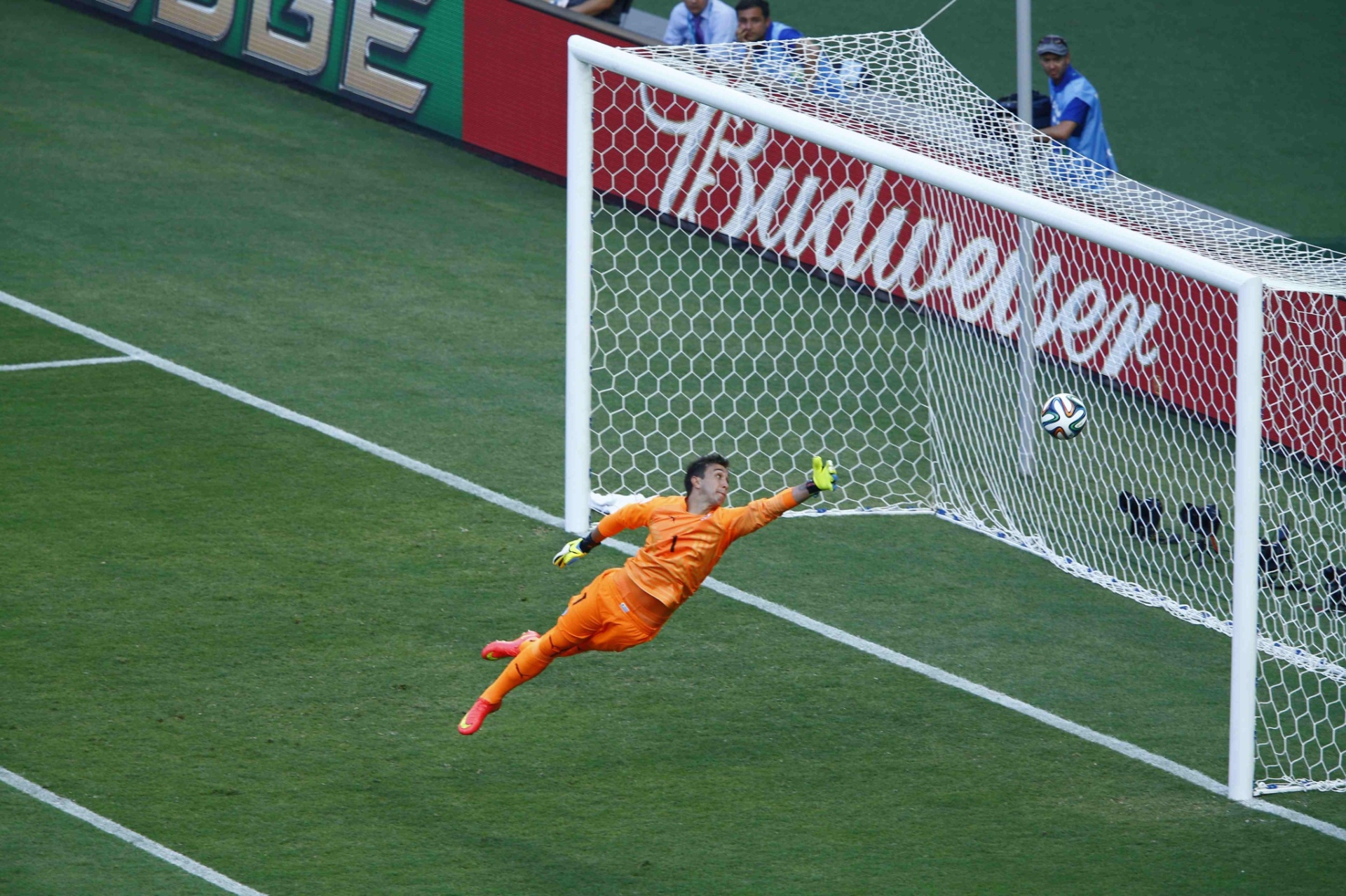 Fernando Muslera se estica para tentar fazer defesa na partida entre Uruguai e Costa Rica