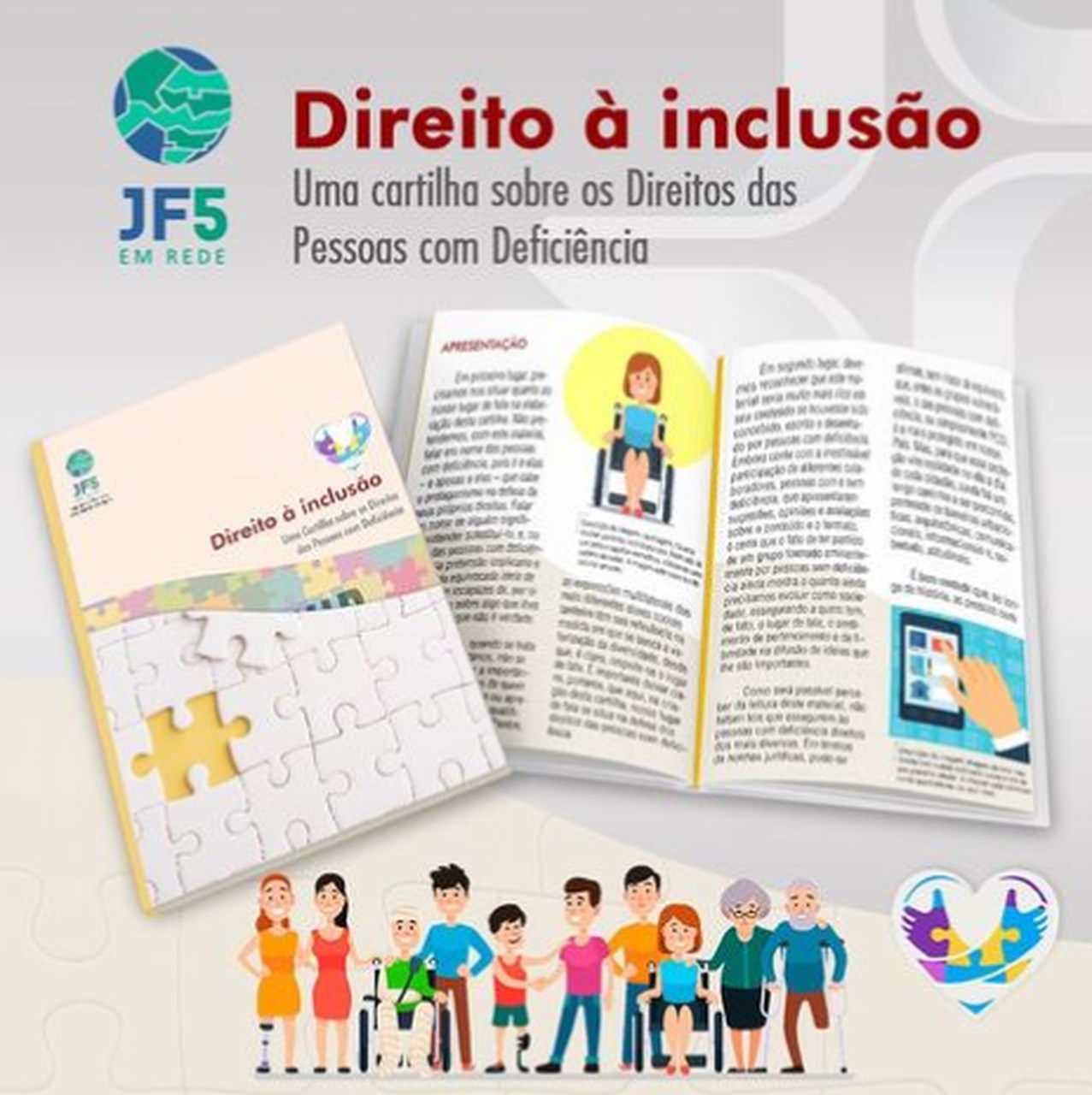 A Justiça Federal da 5ª Região apresenta a Cartilha Direito à Inclusão, uma cartilha sobre os direitos das pessoas com deficiência. A publicação busca disseminar que todos nós somos únicos e diferentes, e que a diversidade pode e deve conviver em harmonia, com oportunidades para todos. O processo de confecção contou com a participação de servidores com deficiência, que contribuíram com correções e sugestões, como por exemplo, a inclusão da descrição das imagens de todas as ilustrações.