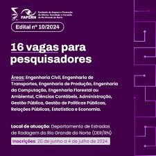 O Departamento de Estradas de Rodagem do Rio Grande do Norte (DER/RN), em colaboração com a Fundação de Amparo e Promoção da Ciência, Tecnologia e Inovação do Estado (Fapern), divulgou o edital Nº 10/2024 para seleção de pesquisadores-bolsistas e coordenador-técnico. Este edital oferece 16 vagas direcionadas a egressos de cursos superiores para participação em projetos de pesquisa e inovação. As áreas contempladas são Engenharia Civil, Engenharia de Transportes, Engenharia de Produção, Engenharia da Computação, Engenharia Florestal ou Ambiental, Ciências Contábeis, Administração, Gestão Pública, Relações Públicas, Estatística e Economia. As inscrições abrem no dia 20 de junho e encerram em 4 de julho de 2024.
